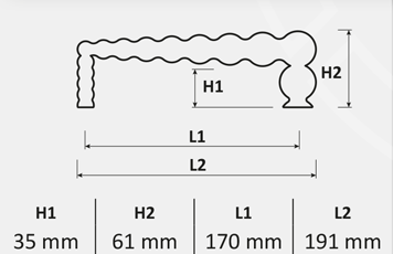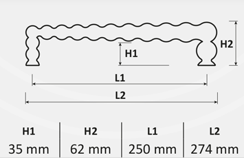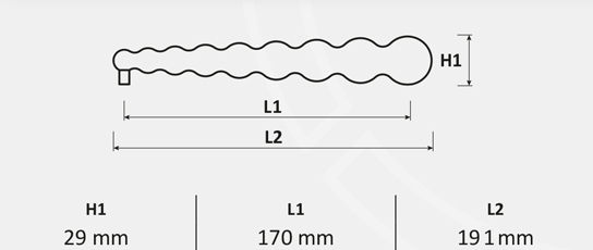 Maniglia di dimensioni importanti, con appendici che conferiscono una linea delicatamente allungata, considerevole spazio tra porta e impugnatura della mano la rendono comunque slanciata.